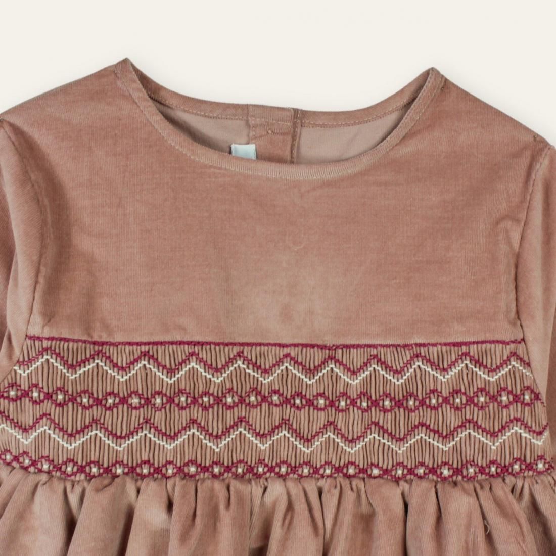コーデュロイ生地に施されたスモッキング刺繍は、職人の手によって丹誠込めて仕上げられており、繊細で美しい仕上がりです。