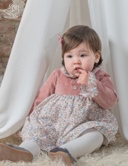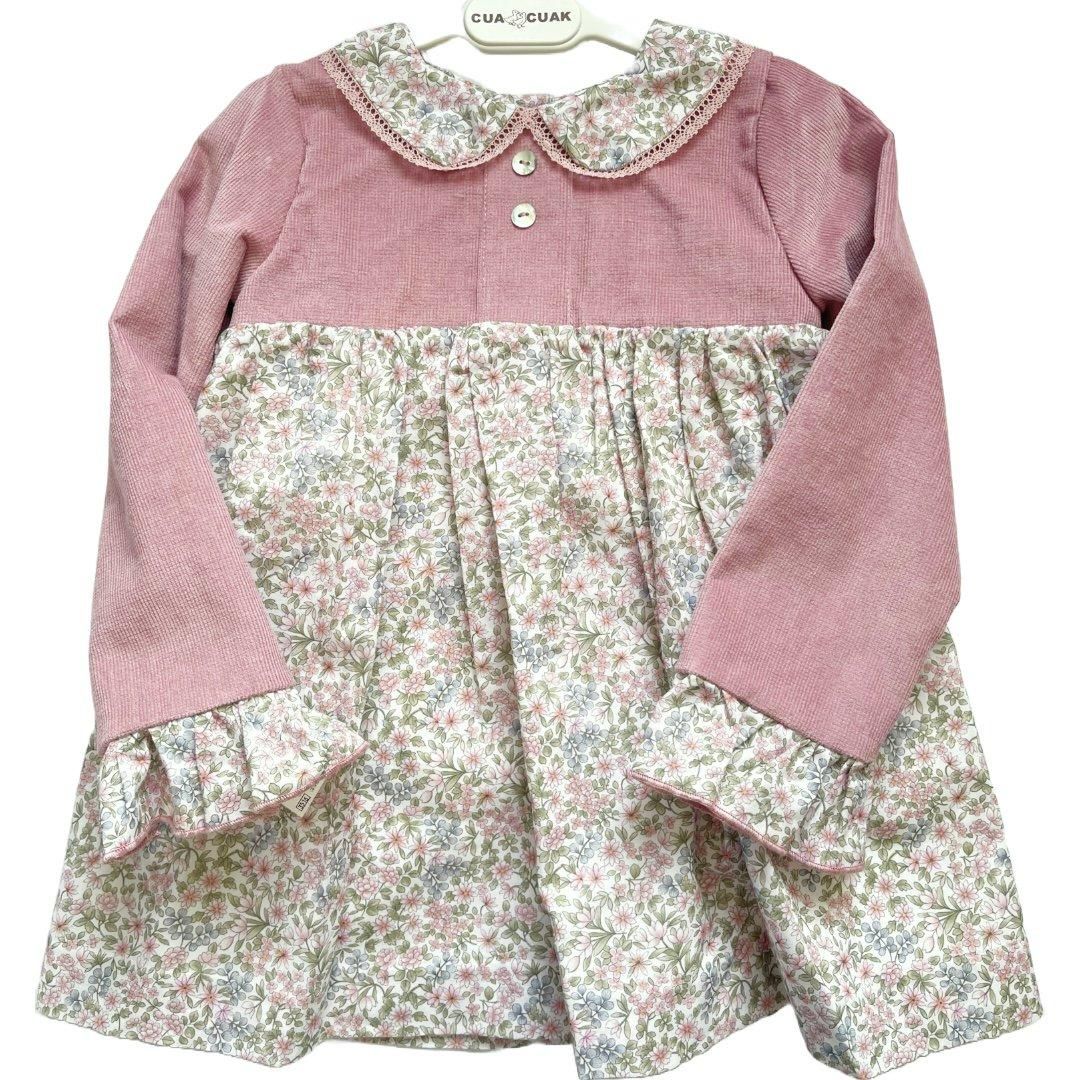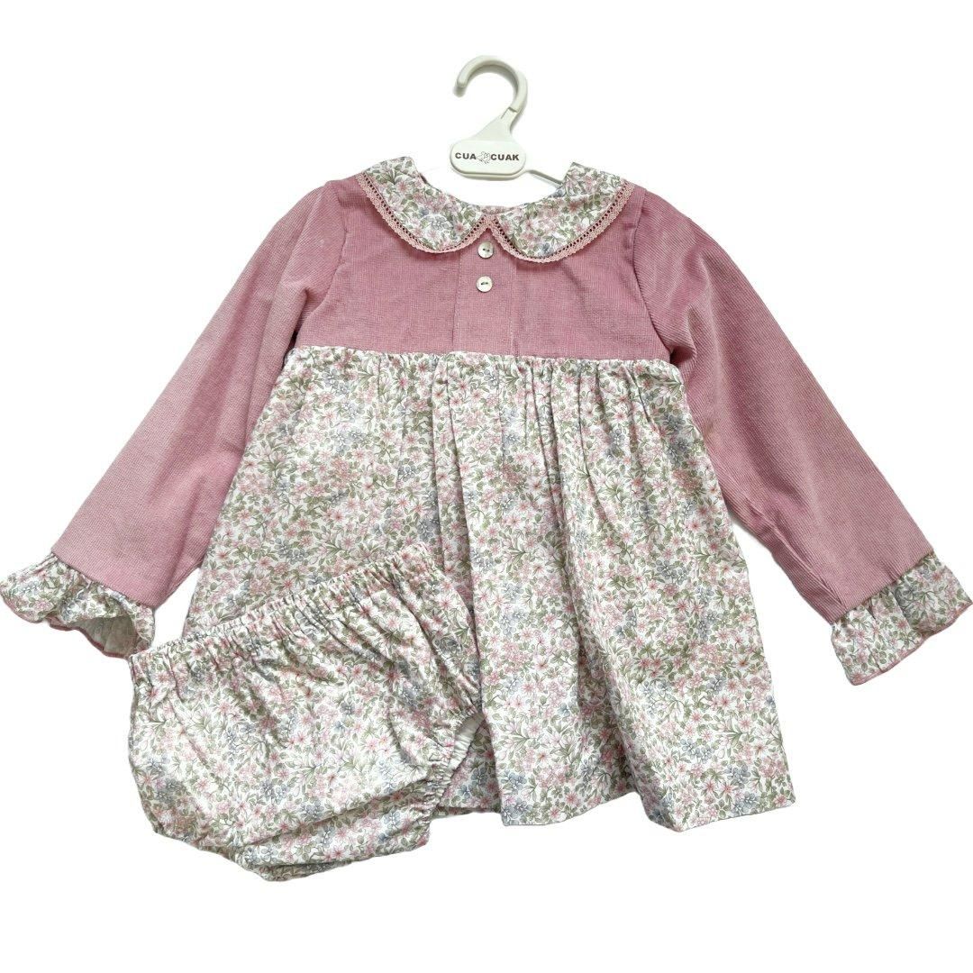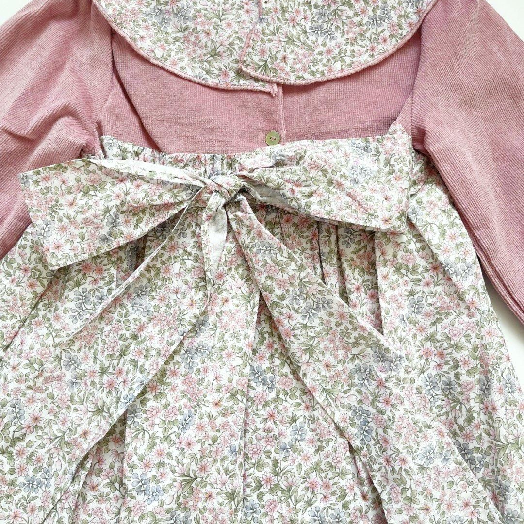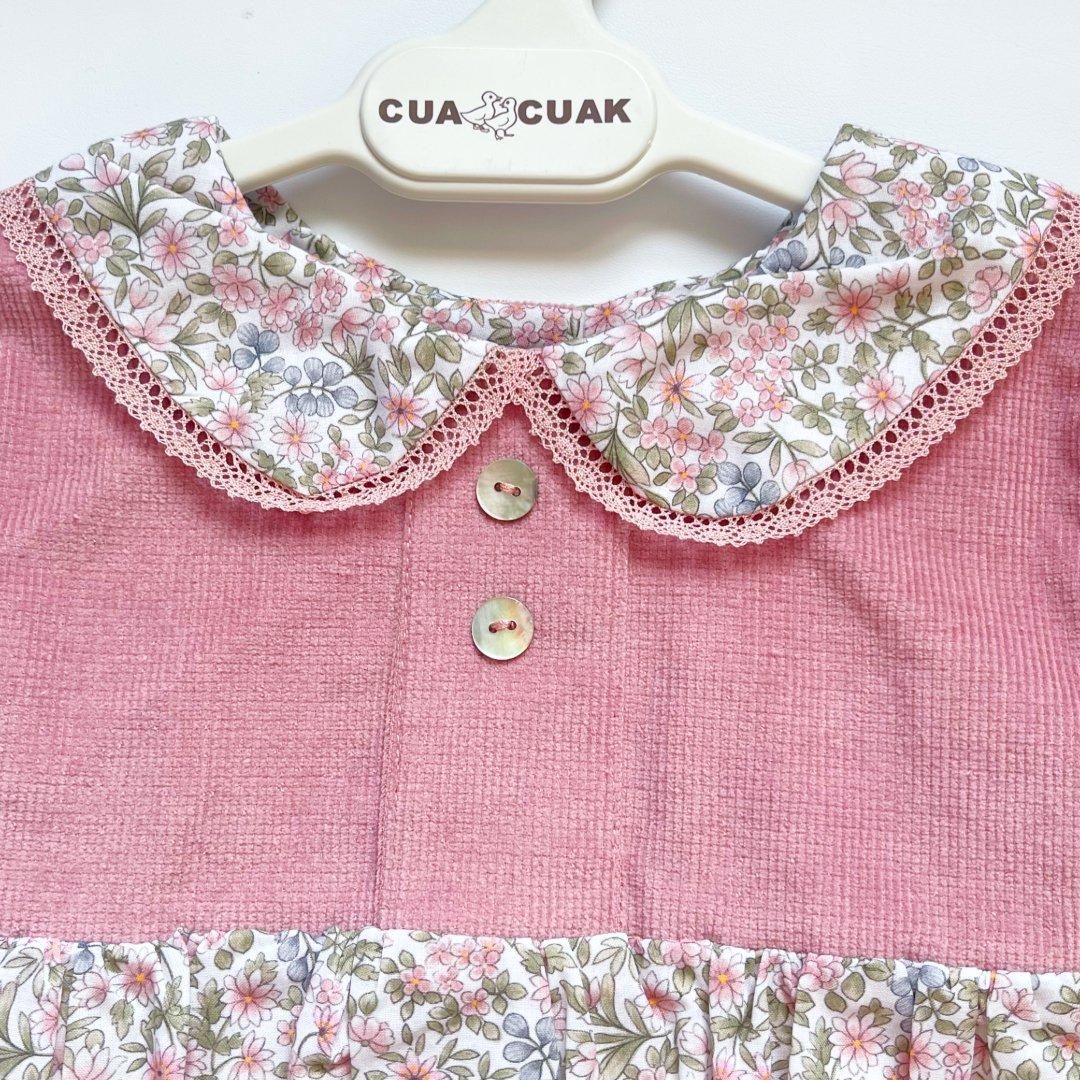 Cuacuak ピンクフラワー ×コーデュロイ ドッキング ベビーワンピース